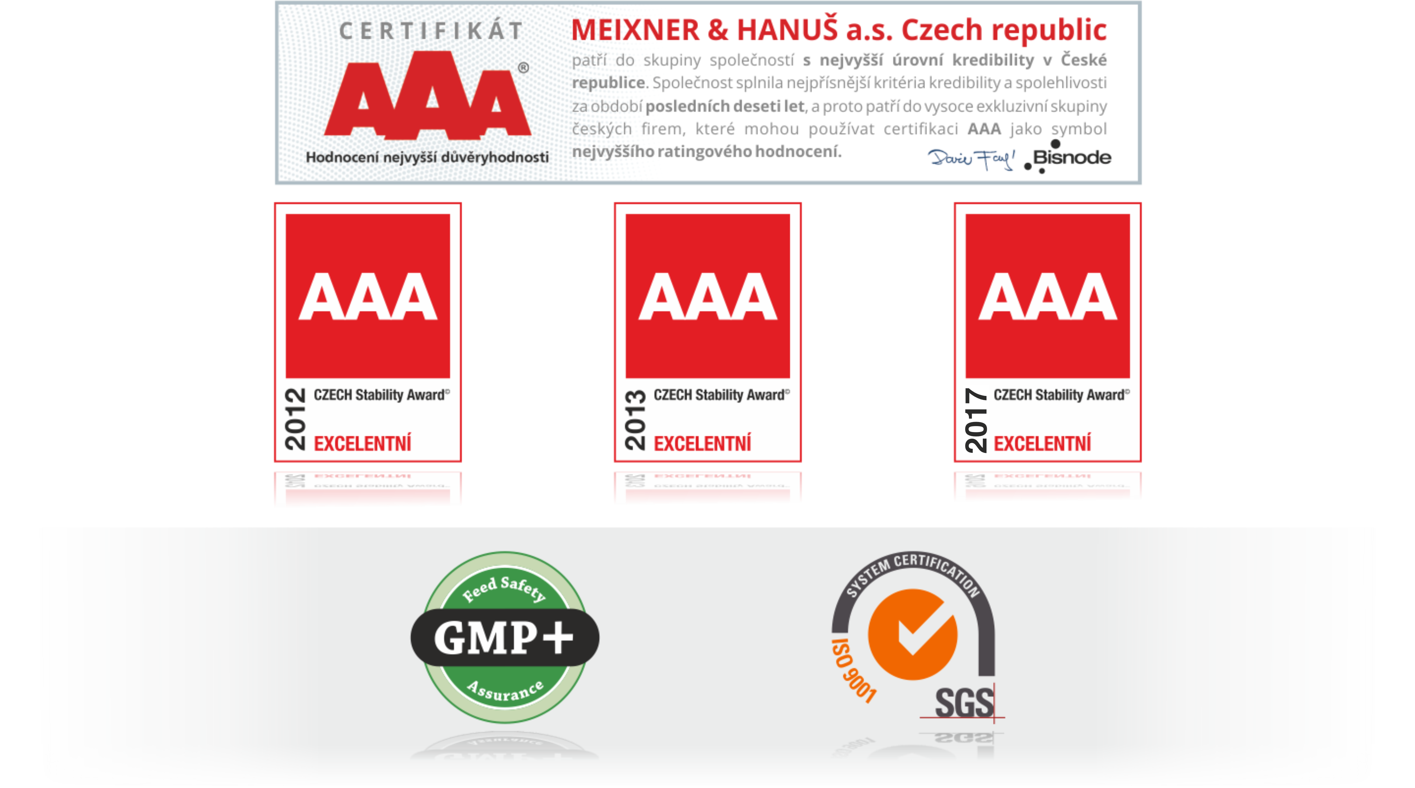 - Společnost v průběhu své činnosti získala ocenění obchodní i finanční stability s nejvyšším možným ratingovým hodnocením AAA a od roku 2022 po součastnost ocenění Platinum Excellence, a zároveň je držitelem certifikátu GMP+, ISO.